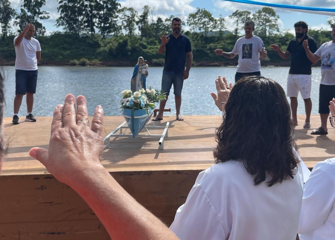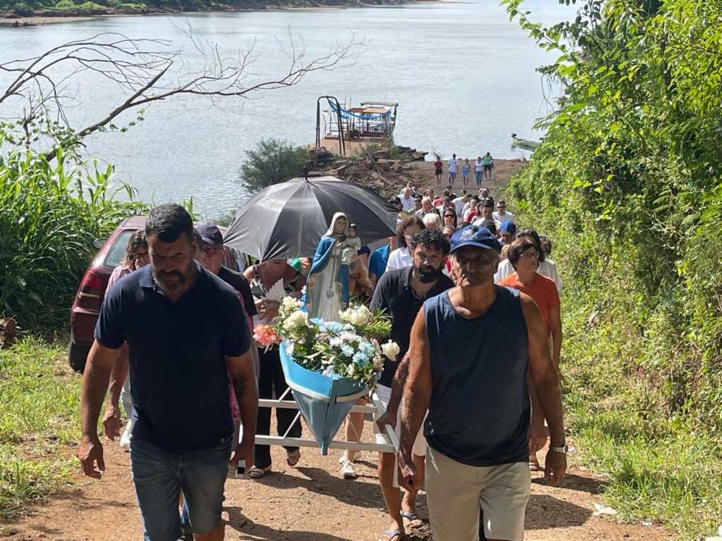 Nossa Senhora dos Navegantes tem o poder de aproximar e reaproximar a comunidade do rio. A imagem da padroeira da comunidade chegou em uma balsa transportada por um reboque, sob os cuidados de um grupo de marinheiros que repete o ritual há muitos anos. O percurso foi curto. Ao som de foguetes e buzina, a comitiva saiu por volta das 9h30min do depósito da empresa J. Viana, que atua no ramo de comércio de areia, e chegou à chamada ‘rampa da Santinha’. Ali, foi recepcionada pelas ministras da Paróquia, Terezinha Graef Martins e Estela Maris de Freitas, e um grupo de fiéis. A prefeita e exercício, Izaura Landim, acompanhou a chegada.
