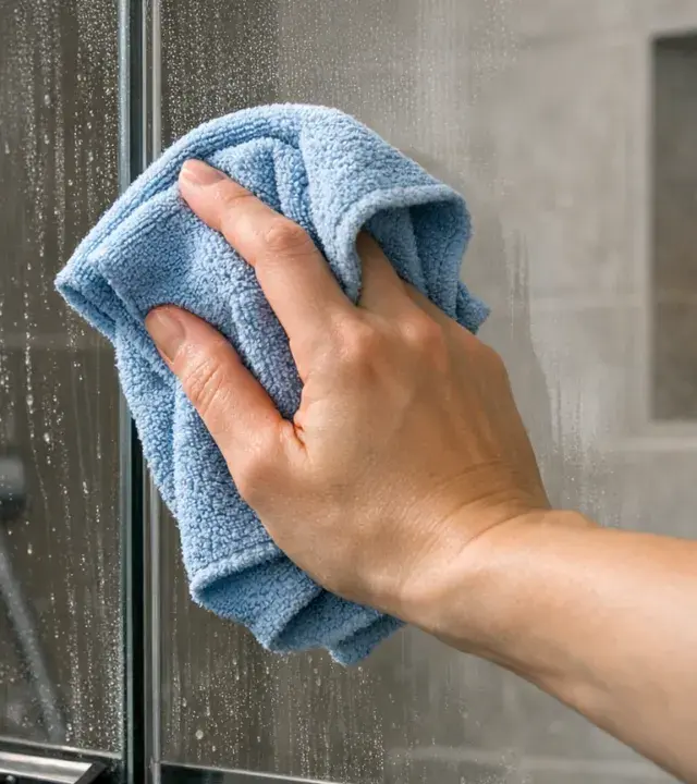 Muita gente acredita que para limpar, basta passar um bom desengordurante ou produto específico já é suficiente. Mas mesmo com os melhores produtos, as manchas esbranquiçadas — causadas por resíduos de sabão e minerais da água — voltam a aparecer. Isso acontece porque o vidro fica com microgotículas que secam e formam essas marcas, mesmo após a limpeza. A limpeza do box precisa de um passo final crucial: a secagem correta com o item certo.