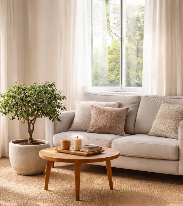 Árvores de interior não são só decoração. Elas mudam a percepção do espaço, criam sensação de frescor e funcionam como ponto focal na casa. Em cidades menores, onde o clima costuma ser mais quente e seco em certas épocas, elas ajudam a equilibrar o ambiente interno.