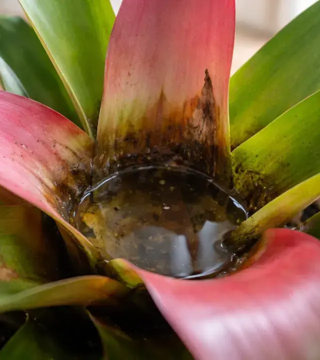 Em ambiente doméstico, a água do copo central costuma ficar parada por semanas. Não evapora como no ambiente aberto, não se renova com frequência e, muitas vezes, recebe água tratada, com cloro e impurezas. Com o tempo, esse líquido vira um caldo perfeito para bactérias e fungos. O centro da bromélia começa a apodrecer de dentro para fora, sem dar sinais imediatos nas folhas externas.