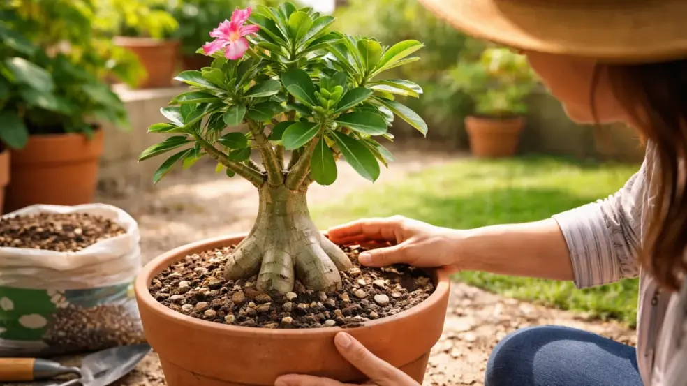 Quem observa de perto percebe que a rosa-do-deserto passa a “se sustentar” melhor no vaso. O tronco parece mais confiante, menos vulnerável ao toque ou ao vento, algo que muitos cultivadores só notam quando comparam fotos de antes e depois de algumas semanas no substrato correto.