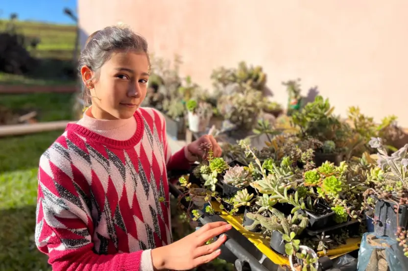 Vasos, potes, rodas de pneu, latinhas e até chaleiras e cuias de chimarrão. Tudo isso serve de recipiente para Camila Raíssa de Bittencourt, de 11 anos, cultivar o que mais gosta: suculentas. No pátio da propriedade onde mora, em Vila Palanque, na divisa com Linha Herval, no interior de Venâncio Aires, são centenas de mudinhas plantadas com o auxílio da mãe, Rosana Graziela da Rosa. Longe das telas no tempo livre, a menina prefere cuidar das plantas e colocar a mão na ‘massa’.