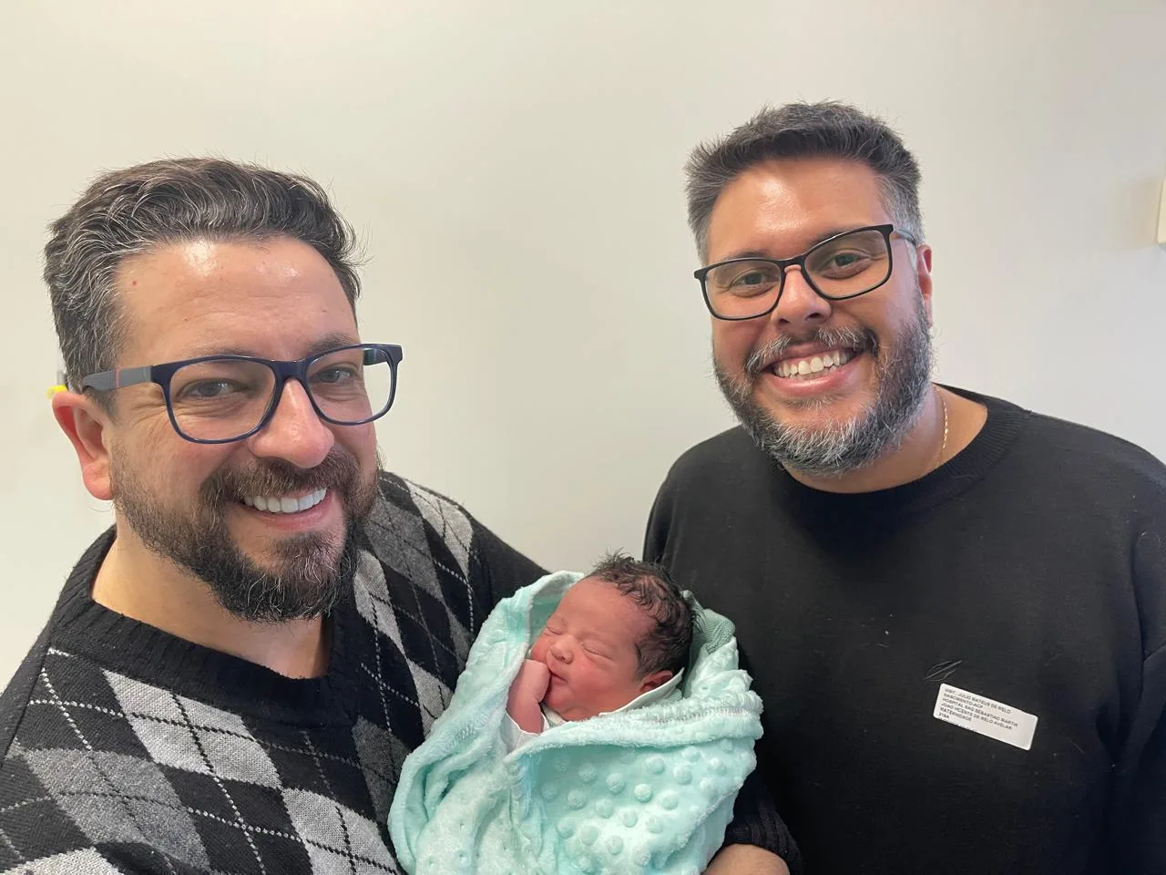 O pequeno (na verdade nem tão pequeno assim) nasceu com 50 centímetros e 3,405 quilos, de cesariana, a qual foi submetida Sandriele da Silva Soares, 36 anos, a mulher que ‘doou’ o útero para realizar o sonho dos amigos Édson Miguel de Barros Avelar, 40 anos, e Júlio Mateus de Melo Nascimento, 37, o casal que decidiu ter um filho por meio de gestação de substituição ou cessão temporária do útero, como também é conhecida a barriga solidária. Essa história a Folha do Mate contou em primeira mão, em fevereiro de 2025, quando a gestação tinha cerca de dois meses.