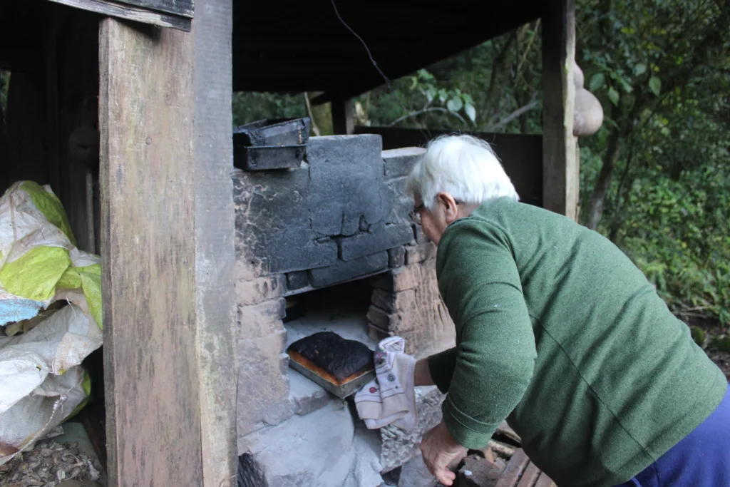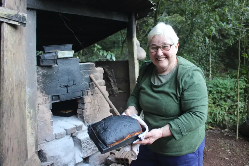 O momento de abrir a portinha do forno, feita com uma lata e alguns arames, é sempre especial. O cheiro característico do pão assado à lenha, morno e adocicado, preenche o ambiente, remetendo às casas de vó. A casca dourada, levemente tostada pelas brasas, protege o interior macio e úmido. “A gente até compra pão no mercado, ou quando o tempo está ruim fazemos no forninho elétrico, mas nada se compara. O sabor do pão feito no forno é outro”, garante Lori.