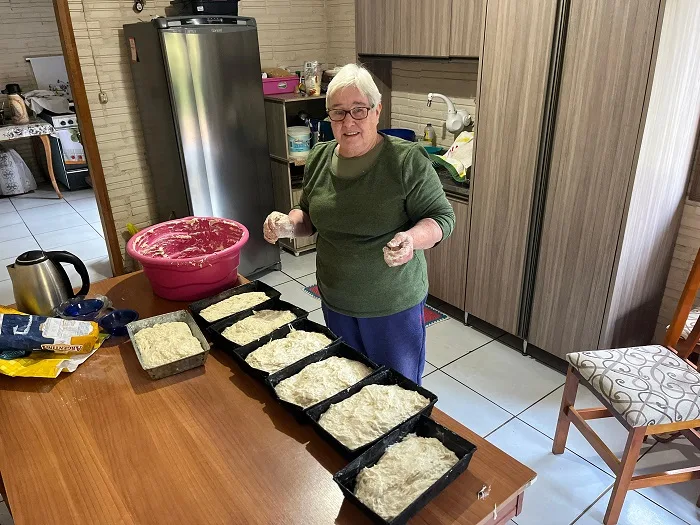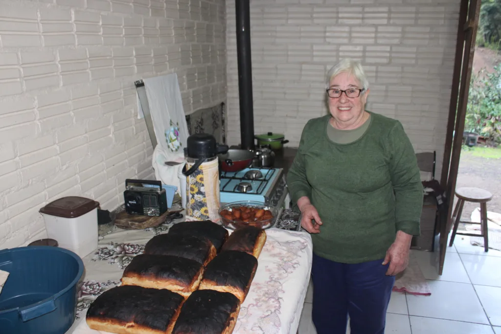 Depois de prontos, os pães descansam para esfriar. “Pode até comer na hora, mas depois a gente não sabe o que vai acontecer”, brinca. A fornada é consumida pelo casal e pelas filhas, especialmente Adriane, que mora ao lado. O restante vai para o freezer, para ser servido no mês. “A gente gosta disso tudo e se sente bem por ainda conseguir fazer”, comenta Lori, orgulhosa.