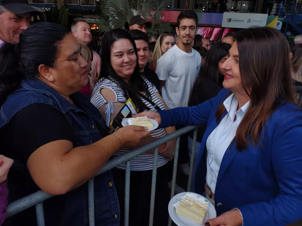 Dizem que aniversário sem bolo, não é aniversário. Então como não providenciar um bolo grande suficiente para marcar os 134 anos de Venâncio Aires? Pois quem foi no Chimarródromo prestigiar o momento do ‘parabéns’ à cidade, degustou uma fatia do bolo preparado especialmente para a data. A responsável foi a confeiteira Carine Eisermann, da Cakes da Cah e ganhadora do Festival Gastronômico com a receita de Muffin. O bolo foi preparado com recheio de Kinder e Alpino. Quem recebeu a primeira fatia foi Cleci da Rosa, de 72 anos, a mãe do prefeito Jarbas. “Já que não pude passar o dia com ela, mas ela está na Fenachim, a primeira fatia vai para minha mãe”, disse o prefeito.