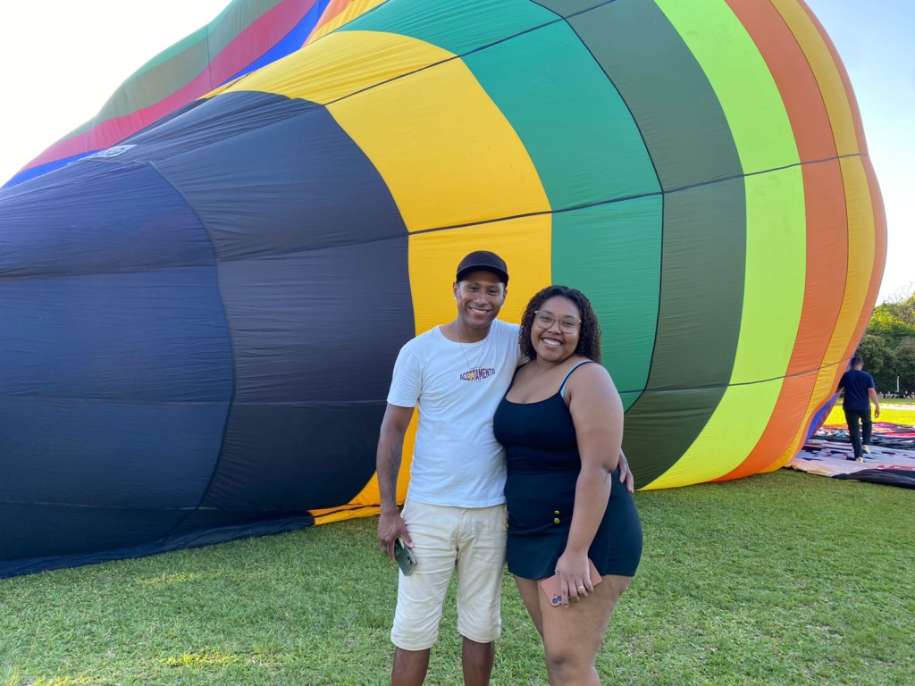 A emoção de chegar pertinho dos balões gigantes não é vivenciada apenas por quem voa. O público que acompanha cada momento da montagem e preparação para o voo também se emociona. Para o casal Juliana Lima, de 26 anos, e Luís Henrique, de 34, a experiência de ver os balões a poucos metros de distância no campo da Assive foi especial.
