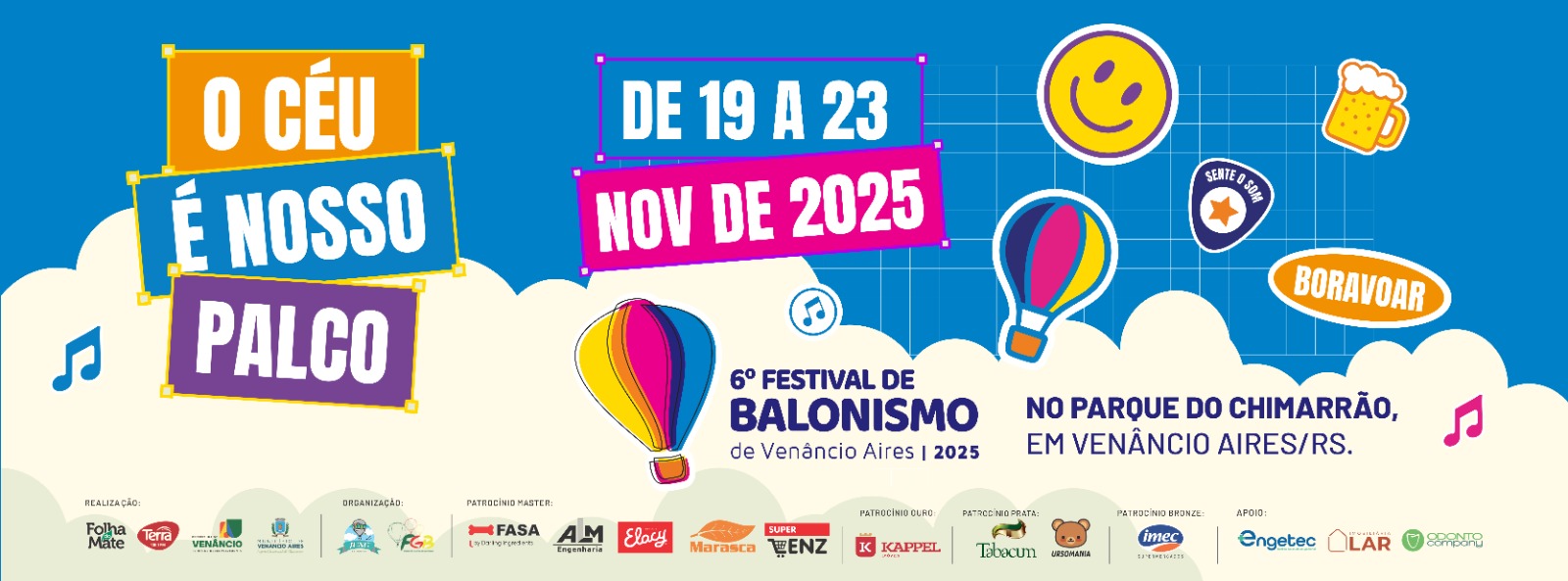O Festival de Balonismo de Venâncio Aires é um dos maiores eventos turísticos e culturais do município, reunindo milhares de pessoas em torno de um espetáculo que une esporte, lazer e tradição. Realizado anualmente no Parque do Chimarrão, o evento conta com voos competitivos e panorâmicos, balões em formatos especiais, shows, feira de artesanato, gastronomia local e atrações para toda a família. Com ENTRADA GRATUITA, o festival movimenta a economia local e consolida Venâncio Aires como referência no calendário de eventos do Rio Grande do Sul.