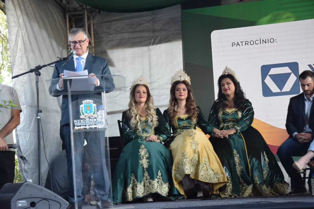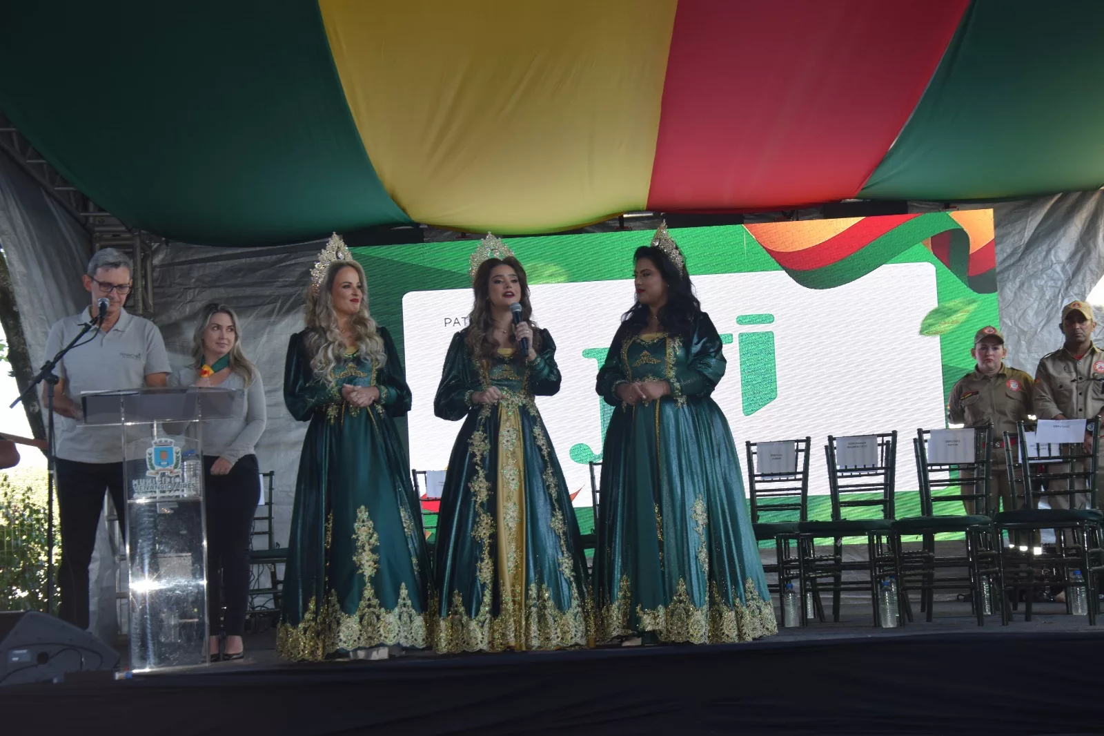 A cerimônia começou com a exibição de imagens e manchetes sobre a enchente de 2024, que castigou o Rio Grande do Sul e Venâncio Aires. Foi por causa da catástrofe climática que a festa precisou ser adiada para 2025, por isso, a emoção era visível em muitos rostos. As soberanas Marina Severo Jantsch, Larissa Almeida Maciel e Ana Flávia Dornelles de Ávila, não seguraram as lágrimas quando entraram no Chimarródromo Arnildo Bento da Silva, ao som da música-tema da Fenachim. “Se somos a festa que reúne amigos, que não nos esqueçamos de quem nos deixou essa herança. É sorvendo chimarrão que ouvimos tantas histórias. E essa Fenachim é para celebrar nossa união e nossa força”, destacou a rainha Marina.