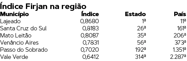 Semana passada, a Federação das Indústrias do Estado do Rio de Janeiro (Firjan) divulgou estudos sobre o desenvolvimento socioeconômico dos municípios brasileiros. O chamado Índice Firjan é realizado desde 2008 (ano base), sendo divulgado a partir de 2013. O estudo acompanha a evolução de três áreas: emprego e renda, saúde e educação. Mato Leitão, pelo segundo ano, se mantém na parte mais alta da relação, superando a barreira de 0,8 ponto. O mesmo acontece com o setor de emprego e renda. Educação e saúde seguem em patamares moderados de desenvolvimento (acima de 0,7 ponto). Na microrregião, Cidade das Orquídeas tem o melhor desempenho, com índice superior a Venâncio Aires, Passo do Sobrado e Vale Verde.
