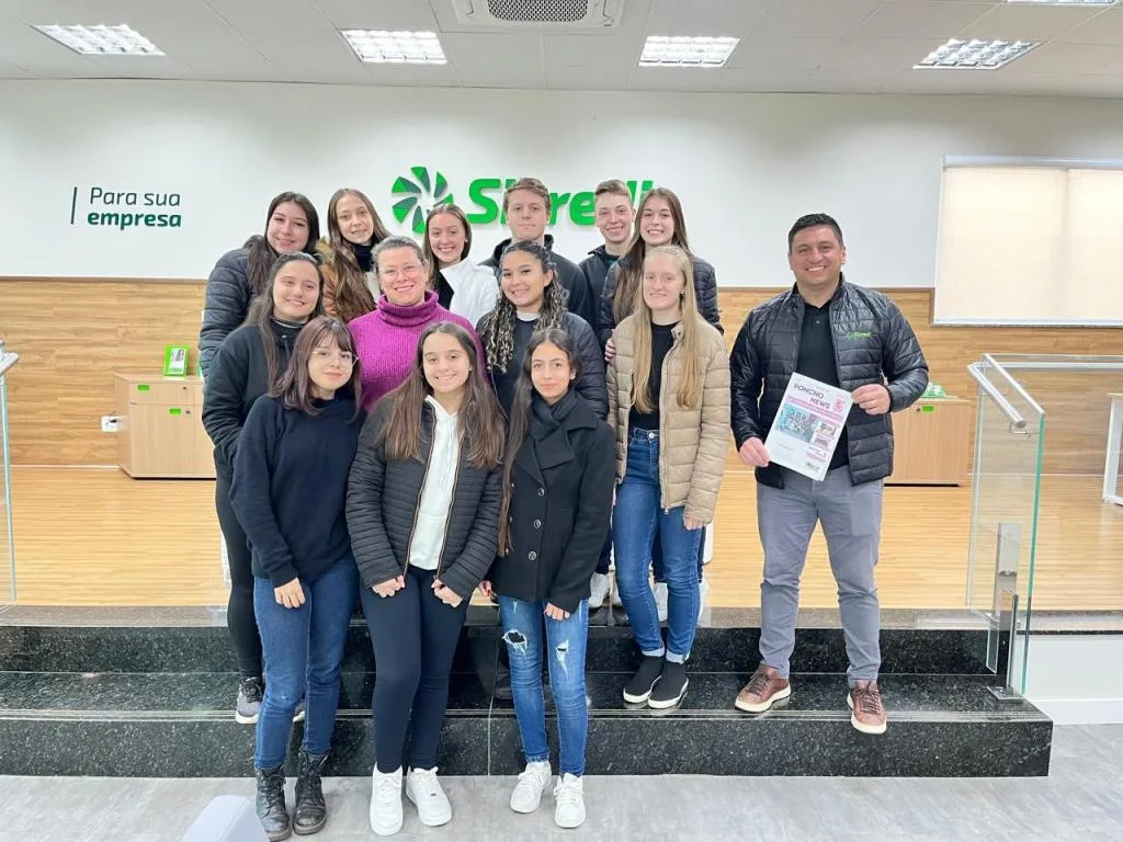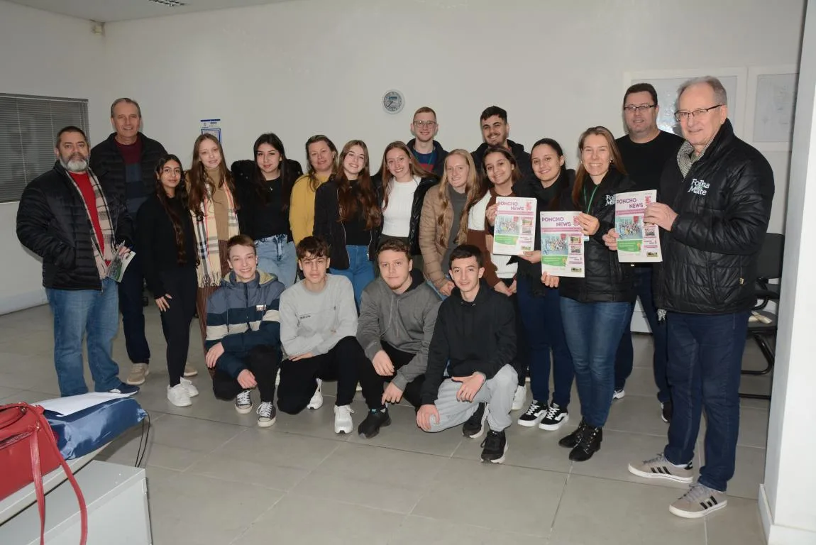 Pela segunda vez no ano, alunos da 2ª série do Ensino Médio do Colégio Estadual Poncho Verde visitaram a redação da Folha do Mate e o estúdio da Terra FM, em Venâncio Aires. Na primeira vez, em março, para conhecer um pouco mais do processo de produção de notícias, edição, montagem e publicação de notícias. Na sexta-feira passada, 18, o grupo retornou para distribuir exemplares do Poncho News, um jornal de oito páginas, no formato A4, com matérias, entrevista, artigo e entretenimento feito pela turma.
