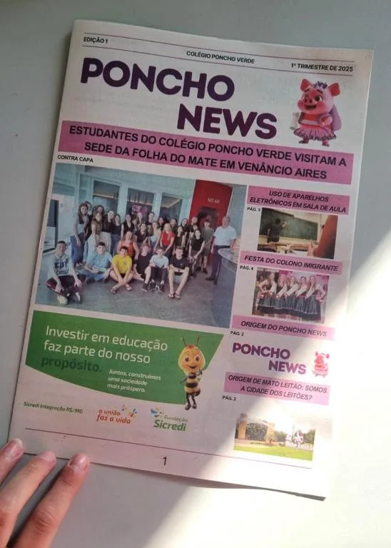 A professora de Geografia, Carina Rejane Simon, coordena o projeto. Ela explica que, após a primeira visita à redação da Folha do Mate, a turma iniciou a etapa de levantamento dados, entrevistas, produção de matérias e seleção dos conteúdos. O uso de aparelhos eletrônicos e a Festa do Colono Imigrante, por exemplo, são destaques desta primeira edição do Poncho News.