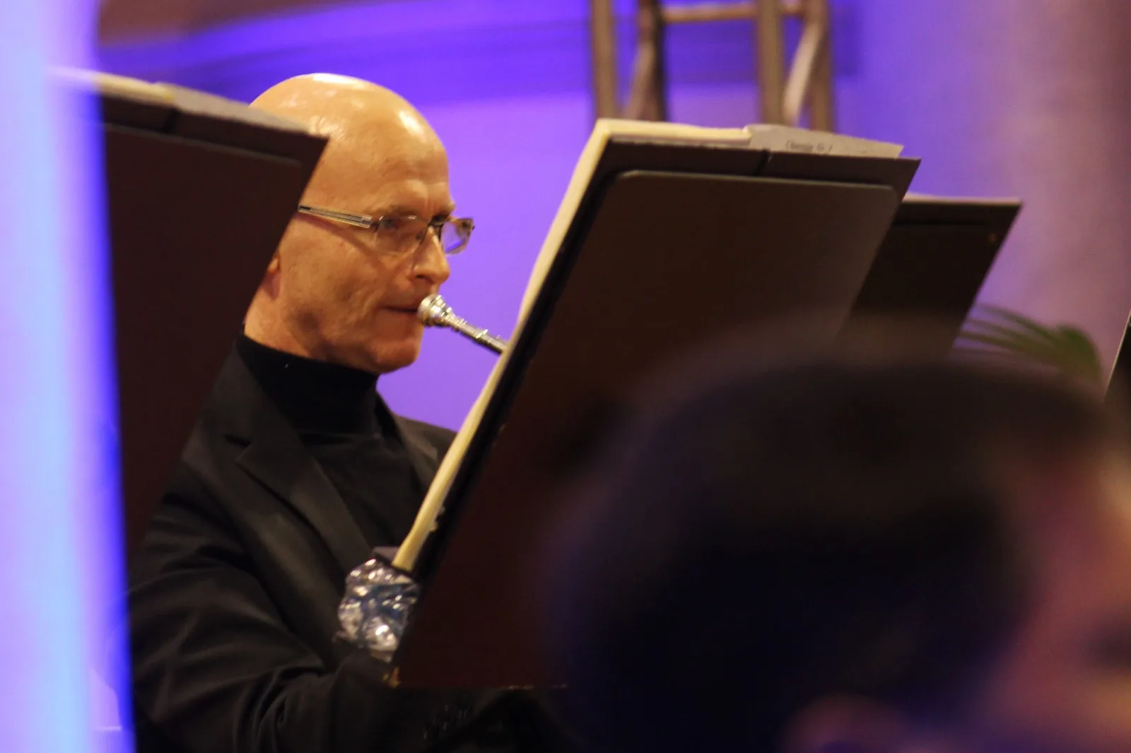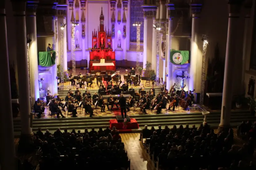 Alguns expectadores foram acomodados no mezanino. Outros, assistiram o espetáculo em pé, ao fundo do grande salão paroquial, que, por volta de 1 hora e meia, teve cada espaço preenchido pelo som das obras de Ludwig van Beethoven (Abertura Leonora Nº 3, op.72b), Camille Saint-Saëns e John Glenesk Mortirmer (Sonata para Clarinete e Orquestra: allegretto, alegro animato, lento e molto alegro), Felix Mendelssohn-Bartholdy (As Hébridas/Gruta de Fingal, op 26), Luigi Bassi e Mortirmer (Conserto Fantasia sobre motivos da ópera Rigoletto de G. Verdi) e, por fim, Ernani Aguiar (Sinfonia Prima: allegro con brio, lento assai e vivace).