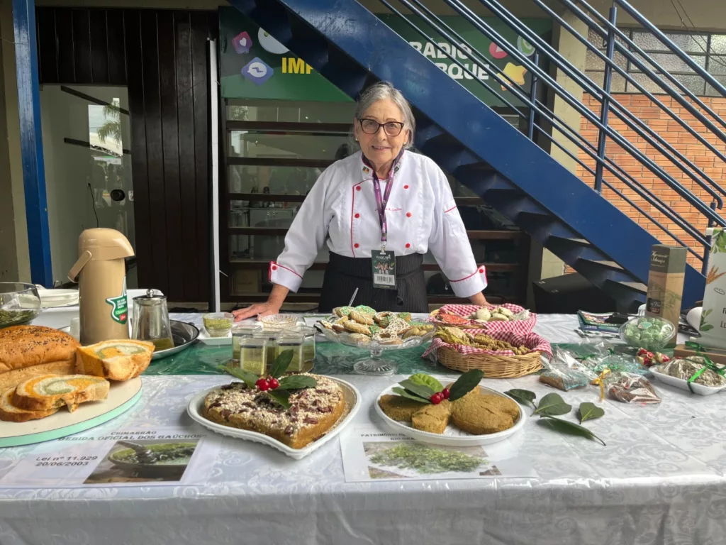 3 No Chimarródromo, uma mesa repleta de gostosuras que levam a erva-mate como ingrediente gastronômico está exposta. Quem apresenta as delícias e compartilha receitas é a professora de culinária Ludmila Gallon, especialista no uso da erva-mate em receitas. Entre as opções para degustação estão bolos, pães, biscoitos e suco refrescante de erva-mate.