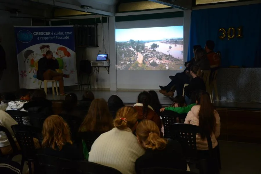 Acomodados no auditória da escola, encravada no bairro Coronel Brito, uma dezena de pessoas assistiu um vídeo mostrando a força da natureza e a destruíção causada em nossa região, principalmente em municípios do Vale do Taquari, como Cruzeiro do Sul, Lajeado, Estrela e Arroio do Meio, entre tantos outros.