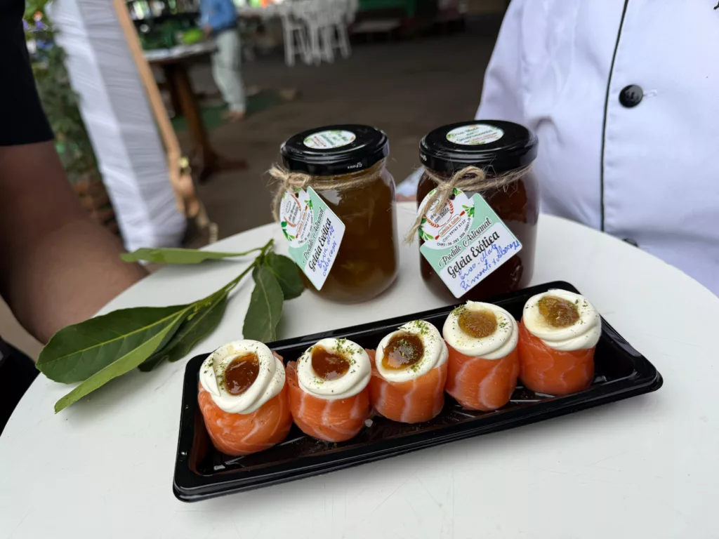 Proprietário do Yoru Sushi, Jairo Júnior conta como foi o processo de invenção do sushi com erva-mate. A empresa está na Fenachim e, entre as peças de sushi, está a chamada Joe, que é consumida acompanhada de uma geleia agridoce. “Comecei a pensar como misturar os sabores e gostos e descobrimos as melhores receitas. Encontrei a geleia produzida pela Ludmila para finalizar. E ficou perfeito”, comenta. A geleia é feita com abacaxi, pimenta e erva-mate.