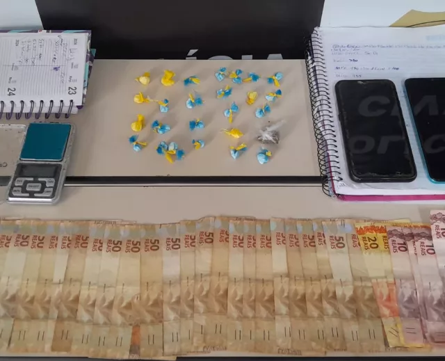 Na casa onde os suspeitos residem foram apreendidas 24 buchas de cocaína, uma porção de maconha, uma balança de precisão, dois celulares e dois cadernos com anotações do tráfico. No local havia uma criança, que foi entregue a um familiar.