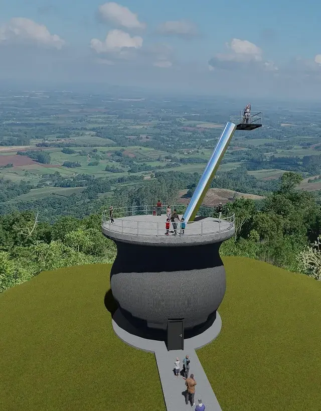 Depois disso, os metros seguintes proporcionarão uma experiência bem diferente aos visitantes. A bomba de chimarrão — um tubo de inox — levará o público, por meio de uma escada, até um mirante com vista exclusiva para a região dos Vales. Conforme o empresário, a área total onde ficará o empreendimento turístico conta com 30 hectares, sendo 1,5 hectare de área dedicada às edificações: o monumento da cuia, três cabanas para hospedagem e um restaurante com capacidade para 450 pessoas. O complexo envolverá ainda outros atrativos em meio à natureza.
