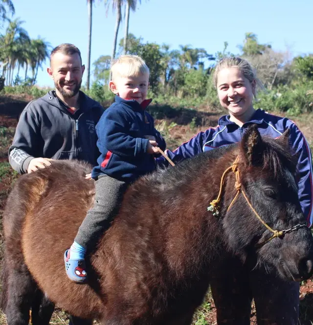 Ragnar começou cedo: ainda bebê, os pais já passeavam com ele em uma carretinha puxada pelos animais da propriedade. Hoje, com mais autonomia, circula com desenvoltura montado em um pônei, como parte da rotina. A liberdade que o campo oferece vem sempre acompanhada da presença atenta dos pais, que o acompanham de perto em todas as atividades.
