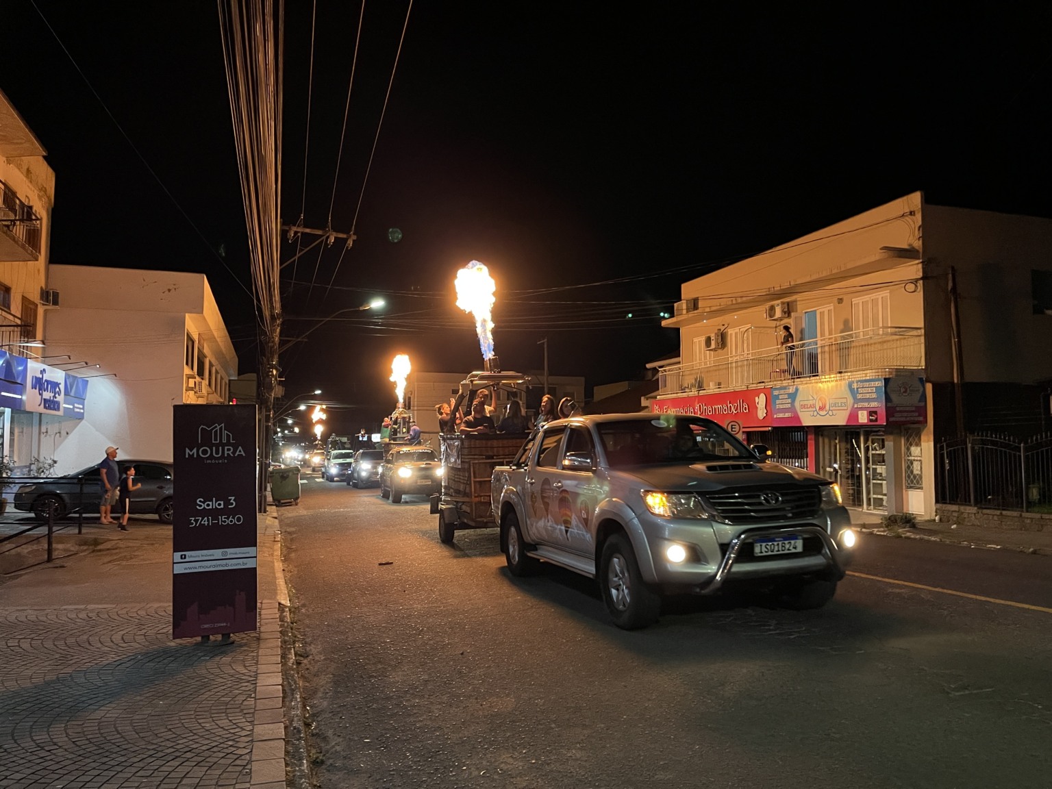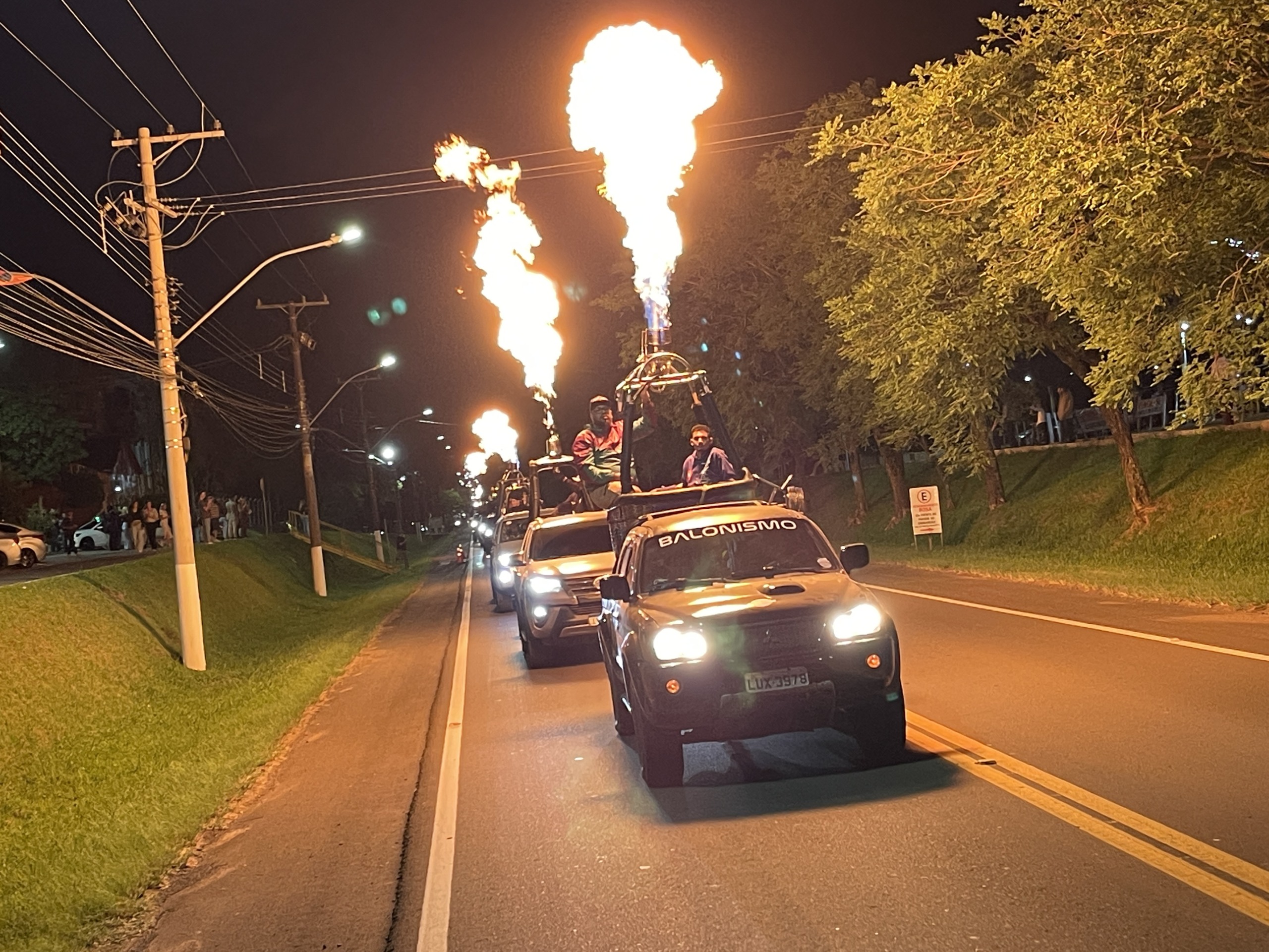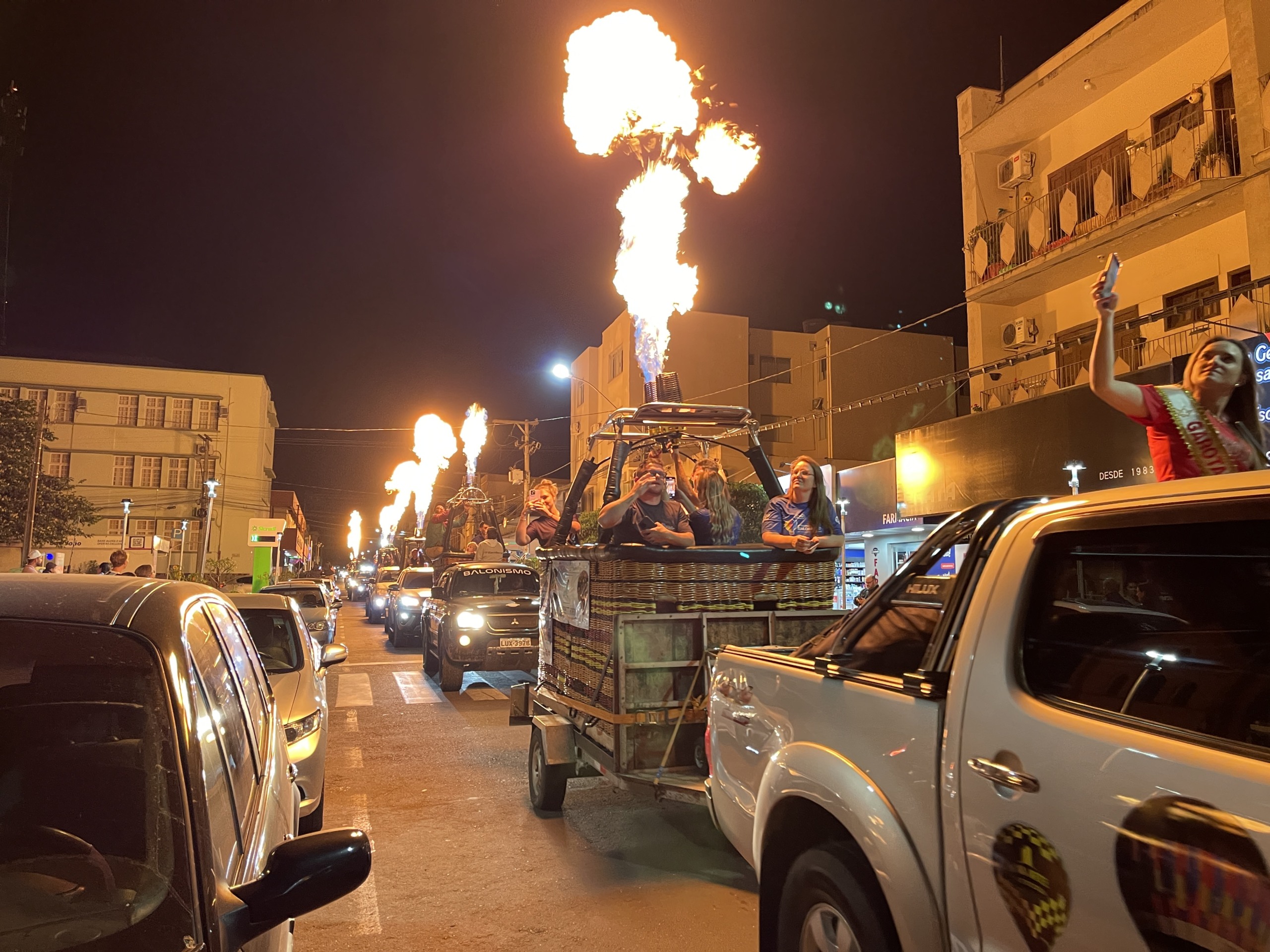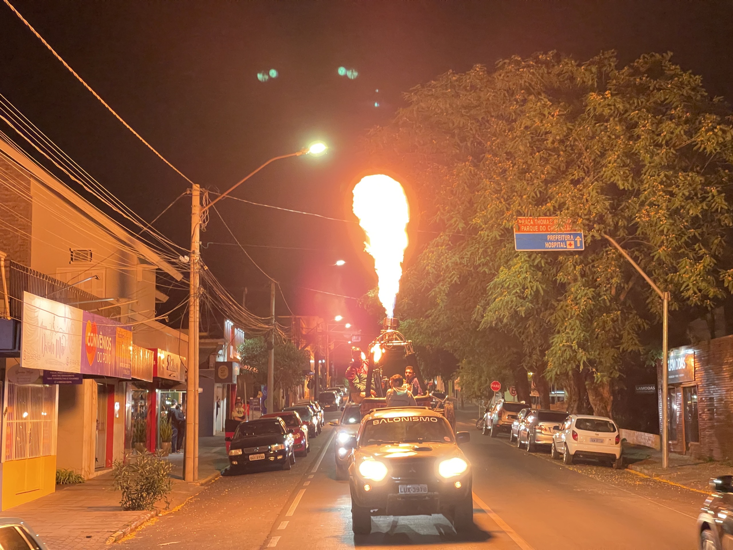 Venâncio Aires - A carreata Ruas de Fogo proporcionou uma programação muito especial para a comunidade de Venâncio Aires, na noite deste sábado, 22. Integrando o 6º Festival de Balonismo, o grupo de balonistas saiu em frente à rodoviária, no bairro Cruzeiro, e passou pelas principais ruas da área urbana, entre Voluntários da Pátria, Osvaldo Aranha e Avenida Ruperti Filho. O público pôde prestigiar um show de luzes, com o acendimento dos maçaricos dos balões.