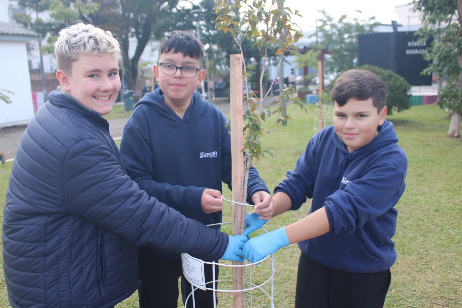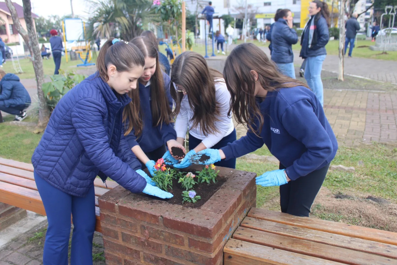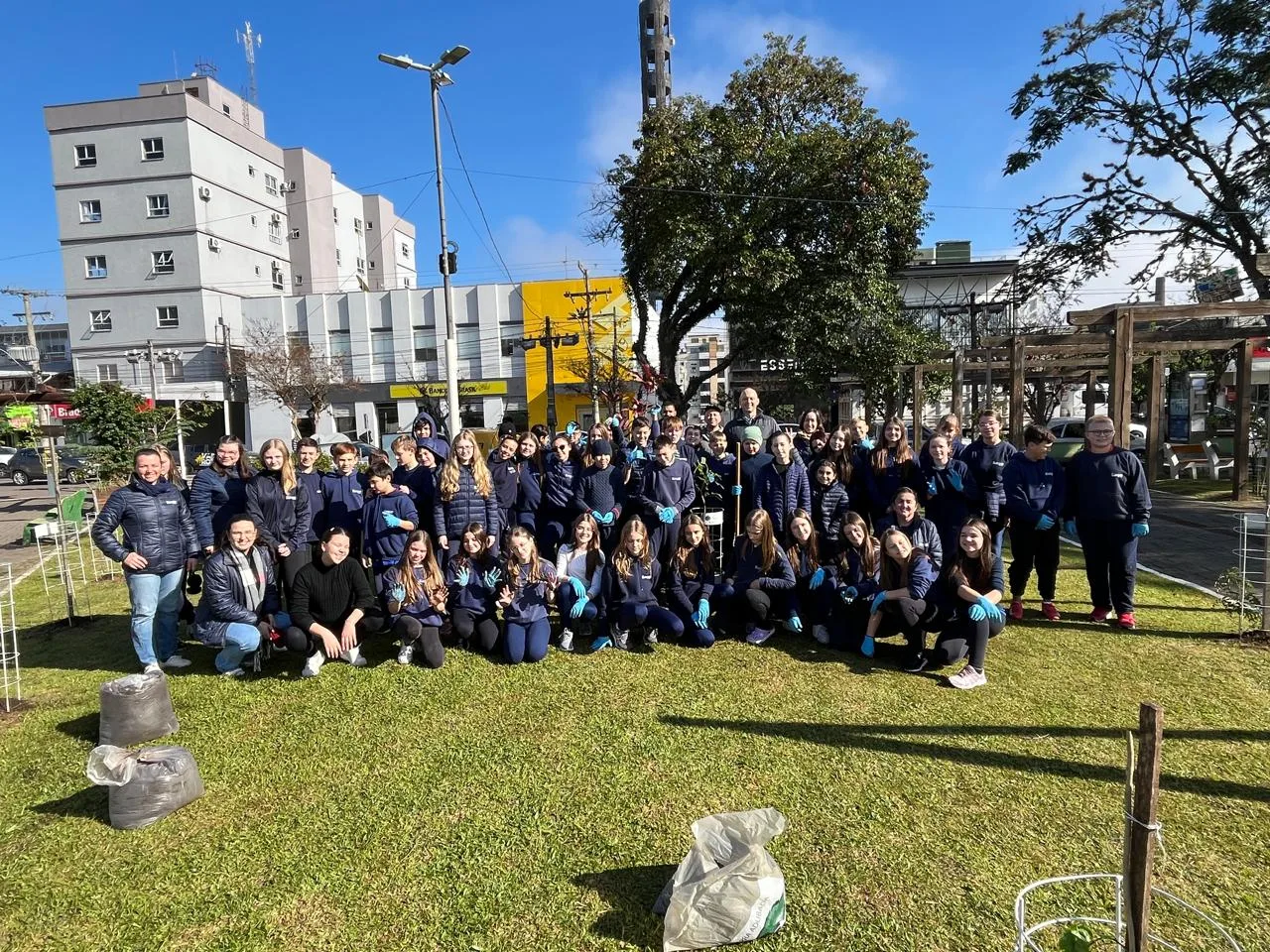 Uma ação ambiental, ainda alusiva à Semana do Meio Ambiente, ocorreu na manhã desta quinta-feira, 12, na Praça Henrique Bender, a Praça Evangélica, em Venâncio Aires. A atividade envolveu 55 alunos do 6º ano do Ensino Fundamental do Colégio Gaspar Silveira Martins e contou com o apoio da Prefeitura. Os estudantes realizaram o plantio de flores e de duas mudas de ipê – sendo um branco e o outro amarelo.