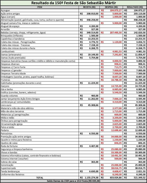 Venâncio Aires - Foram divulgados na noite dessa terça-feira, 11, os números relativos à prestação de contas da 150ª Festa de São Sebastião Mártir, realizada em Venâncio Aires entre os dias 16 e 20 de janeiro. Os dados foram apresentados pelos casais festeiros da edição Cesar Gonçalves e Mariza Schmidt, Marlon Borre e Nair Milene Barbosa, e Romeu Fagundes e Maria Hanzen; casal presidente da paróquia Elmo e Ivone Fengler; e equipe administrativa.