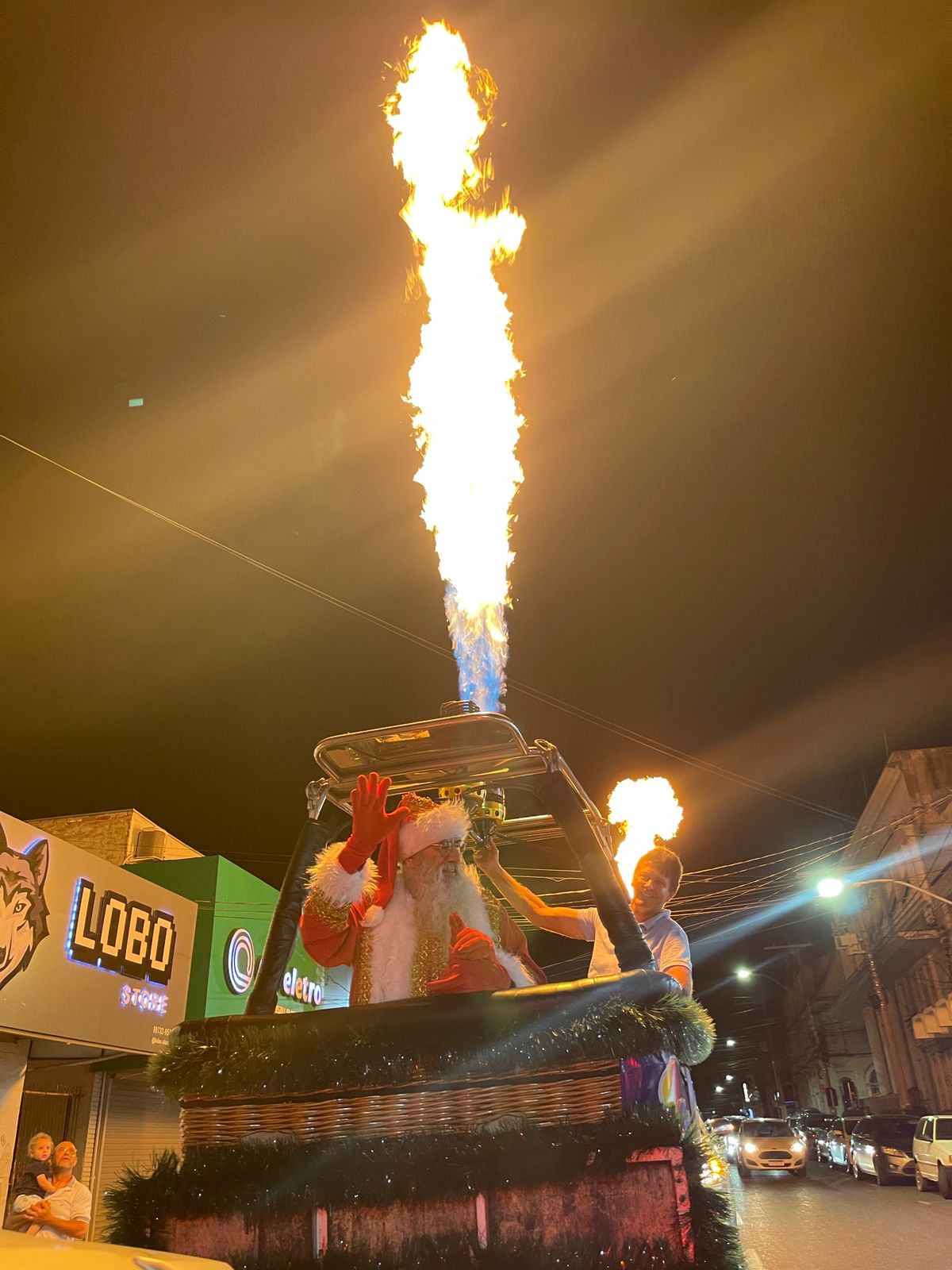 Venâncio Aires - A Travessa São Sebastião Mártir, no Centro de Venâncio Aires, estava lotada para receber o Papai Noel na noite desta sexta-feira, 5. Famílias estiveram reunidas com a expectativa da chegada do Bom Velhinho. E ele chegou por volta das 21h, dentro do cesto de um dos balões do piloto Sérgio Jung.