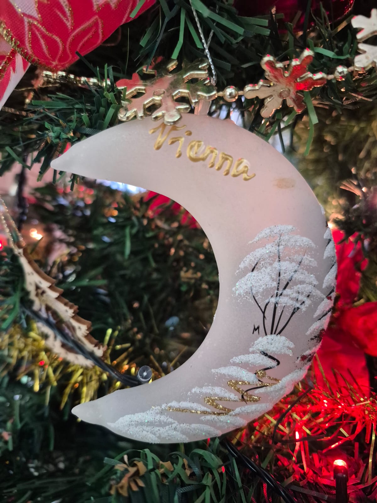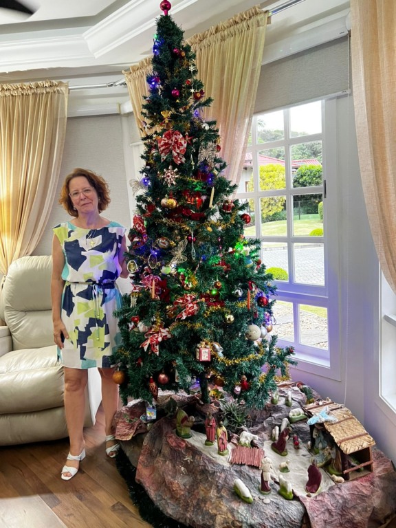 Aqui em casa a tradição do pinheirinho e do presépio se mantém. No pinheiro se encontram diversos enfeites, as tradicionais bolas de vidros e as velas de pinheiro, herdadas da minha sogra, que faleceu em 2009. Bolas e enfeites trazidos das viagens, laços, flores, até enfeites do McDonald’s que as crianças ganhavam do McLanche Feliz. O bolo de Natal que a mãe fazia eu continuo a fazer. É minha pequena lembrança que dou aos meus amigos e vizinhos no Natal.