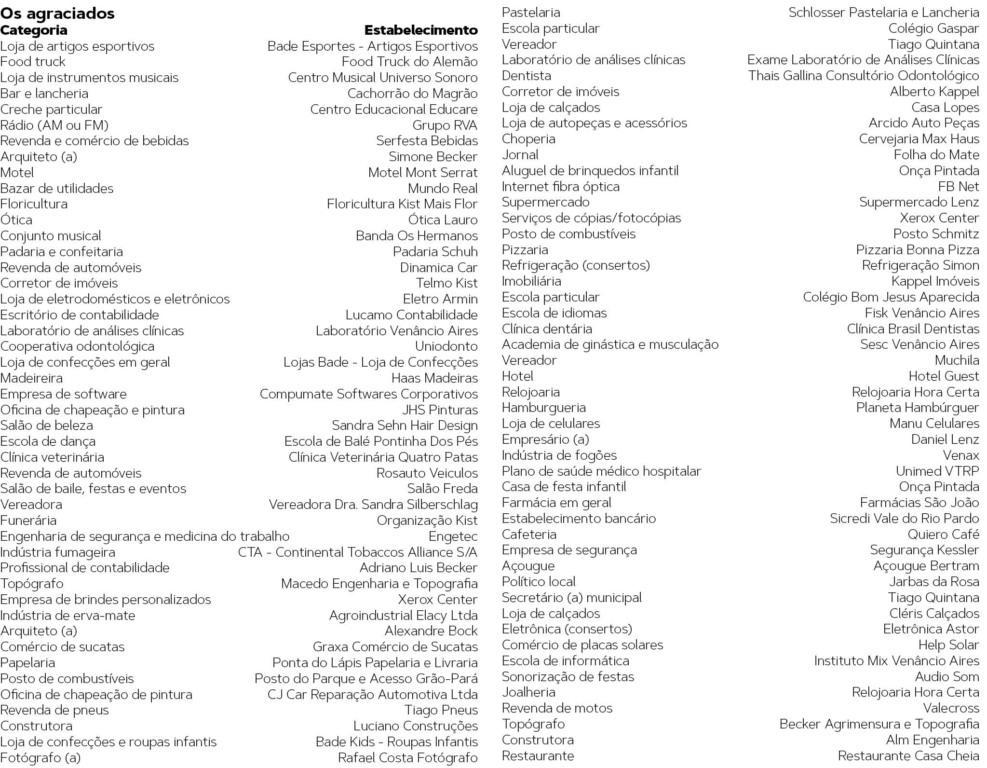 Os nomes foram identificados a partir de pesquisa Universidade de Santa Cruz do Sul (Unisc), realizada em agosto. Nesta edição, foram pesquisadas 107 categorias. Além dos troféus e certificados, as empresas receberam os resultados da pesquisa. Ela foi realizada nos bairros e distritos do município, com 500 entrevistas. O número de entrevistados em cada local foi proporcional ao de habitantes, conforme o Censo do IBGE. Novamente, o jornal Folha do Mate foi agraciado e levou o prêmio de ‘jornal’ mais lembrado.