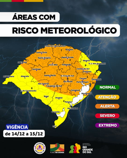 Hoje, o tempo fica instável no Rio Grande do Sul. Há possibilidade para tempestades com rajadas intensas de vento entre 80 km/h e 100 km/h associadas às tempestades, queda de granizo e chuva forte na maioria das regiões. O maior risco de tempo severo é na área em alwerta (laranja) do mapa meteorológico, que inclui Missões, Noroeste, Norte, Centro, Vales, Região Metropolitana de Porto Alegre (RMPOA), Serra e Litoral Médio e Norte. Os acumulados ficam entre 10 mm e 60 mm por dia, com acumulados pontuais podendo chegar a 100 mm/dia nas Missões, Centro, RMPOA e Costa Doce.