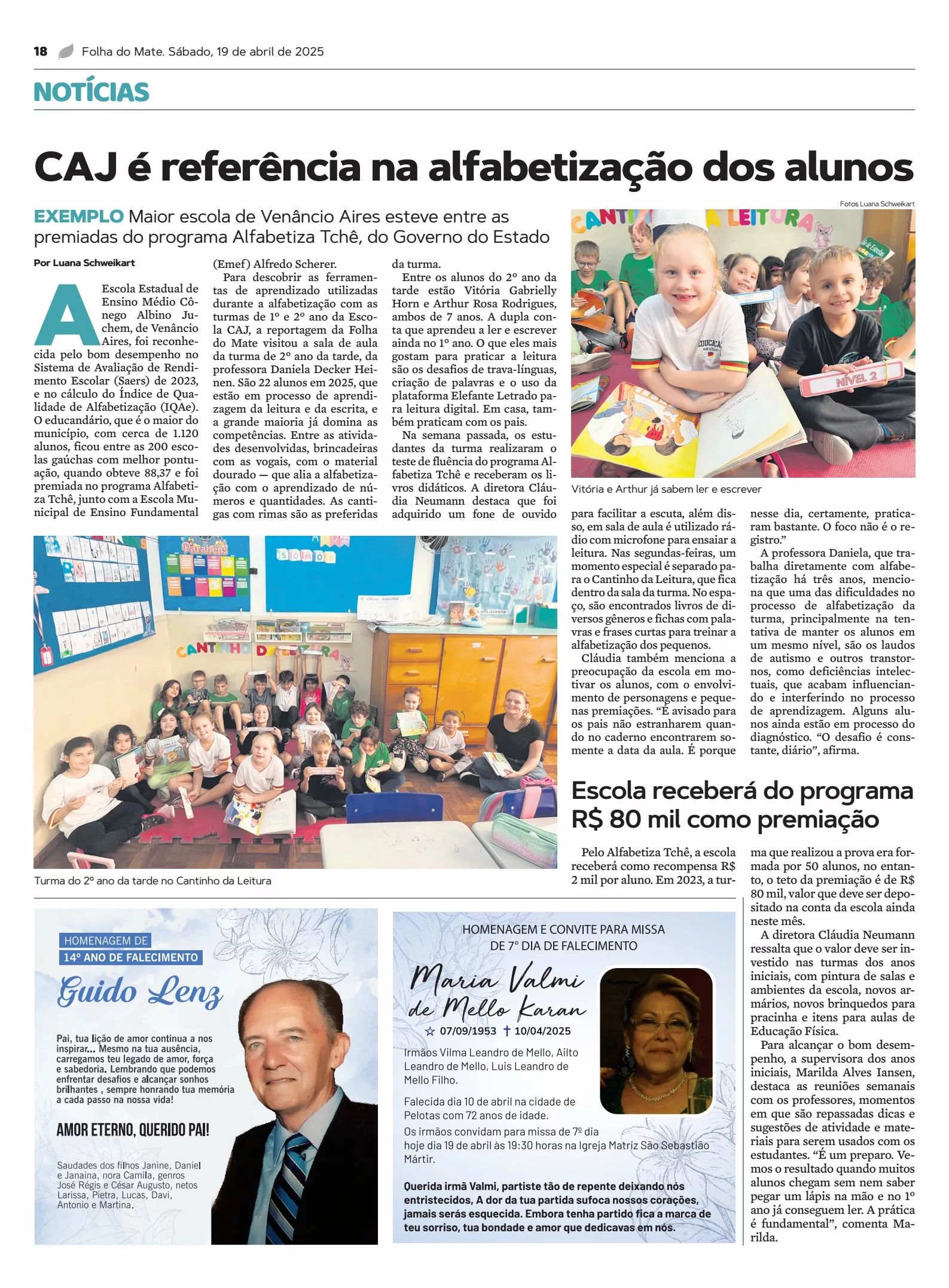 A questão pedagógica, por exemplo, teve destaques recentes. Em abril, o CAJ foi reconhecido pelo bom desempenho no Sistema de Avaliação de Rendimento Escolar (Saers), e no cálculo do Índice de Qualidade de Alfabetização (IQAe). O educandário ficou entre as 200 escolas gaúchas com melhor pontuação e premiada no programa Alfabetiza Tchê. No fim de 2024, teve reconhecimento do Estado no Destaques da Educação no quesito fluência leitora, ultrapassando a marca de 70%.
