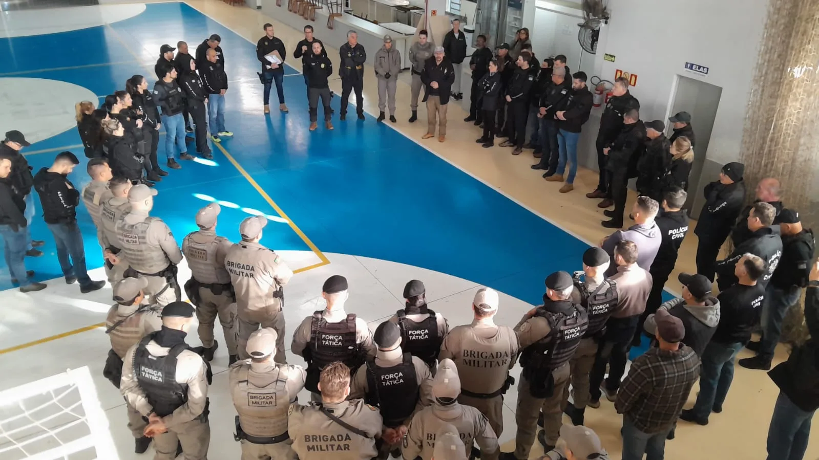 A reportagem acompanha o trabalho do policiamento. São 32 policiais civis, com 12 viaturas, e outros 20 militares, além do delegado regional da Polícia Civil, Jader Ribeiro Duarte, e a subcomandante do 23º Batalhão de Polícia Militar (BPM), major Michele da Silva Vargas.
