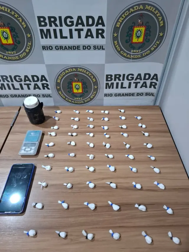 Em apoio à vítima, a guarnição retornou à residência, onde encontrou enterrado um pote contendo 59 porções de substância semelhante à cocaína (53g), além de uma balança de precisão e um celular.