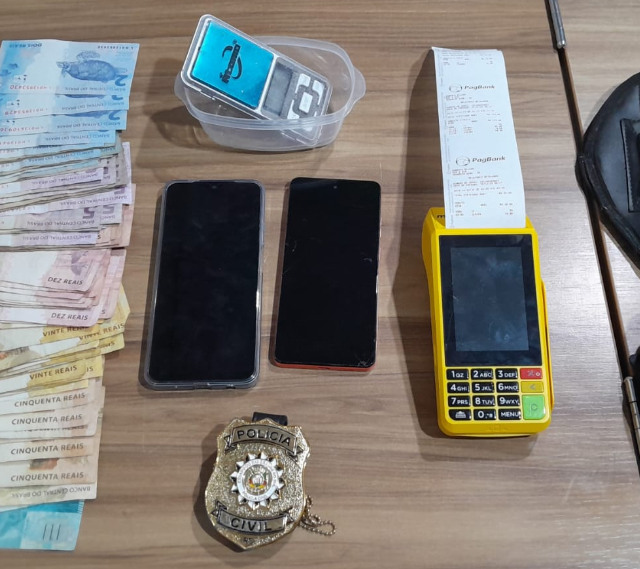Na ação desta sexta-feira, os agentes recolheram R$ 1.151, uma balança de precisão com resquícios de cocaína, uma máquina de cartão, dois celulares e dois coldres de armas de fogo. A moradora não foi presa.