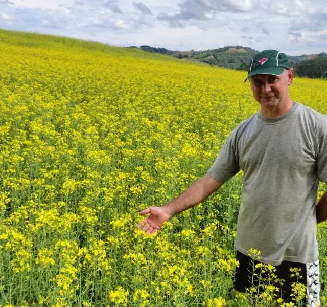 Na propriedade da família Lahr, a principal cultura ainda é o tabaco, seguida da soja. Durante os meses de frio, o trigo ocupava a terra, mas, como a produção acabou afetada nos últimos anos devido ao excesso de chuva, a preocupação foi em buscar uma alternativa. “Sempre que eu passava por Rio Pardo e Pantano Grande, achava curioso e bonito aquelas lavouras amarelas de canola. E como tivemos dois anos complicados com o trigo, de prejuízo, pensei em fazer um teste, até para diversificar com outra cultura”, relata Emerson Leandro Lahr, 43 anos, que fez a primeira experiência em 2024. No ano passado, ele cultivou seis hectares de canola e, em 2025, decidiu não apenas repetir a cultura, mas também ampliar a área, plantando 14 hectares do grão.