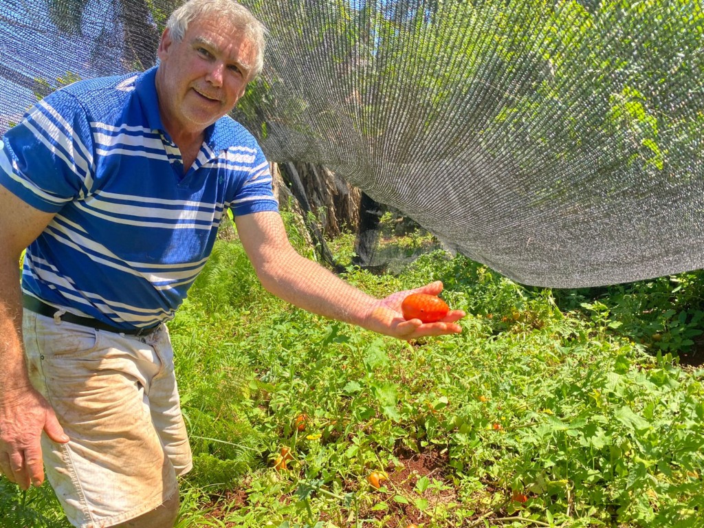 A propriedade possui quatro hectares com diversas culturas. No tomateiro, a opção foi não utilizar irrigação, e, mesmo assim, a planta resistiu bem ao calor. “Usamos uma proteção para o sol, mas percebi que o tomate é bastante resistente, comparado a outras culturas”, afirma Sérgio.