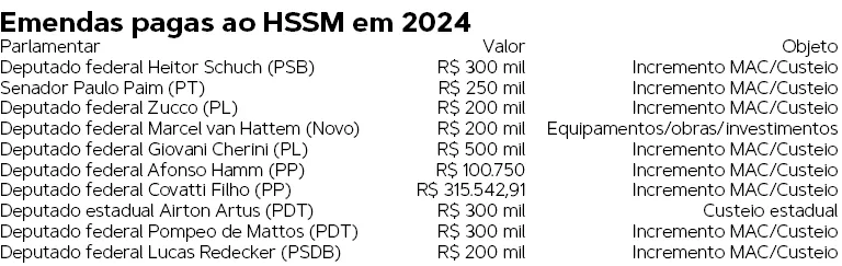 Além das emendas, o hospital teve mais quatro aportes extras do Estado e da União (dois repasses de cada um), que totalizaram R$ 2 milhões. “As emendas são, de fato, muito importantes e vamos continuar buscando”, afirmou Farinon. Segundo ele, uma nova ida a Brasília, para percorrer os gabinetes dos deputados federais, deve ocorrer em outubro.