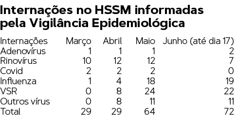 O número de internações por doenças respiratórias no Hospital São Sebastião Mártir (HSSM), em Venâncio Aires, segue subindo. Se o mês de maio fechou com o dobro de hospitalizações em comparação a abril, a primeira metade de junho já superou o próprio maio. Segundo dados da Vigilância Epidemiológica do município, os primeiros 17 dias deste mês contabilizaram 72 internações, sendo a maioria por Vírus Sincicial Respiratório (22) e Influenza (19). Outros 18 aguardam resultado de exames. Ainda conforme a vigilância, há vários pacientes internados com dois tipos de vírus respiratórios ao mesmo tempo e todos os casos de Influenza detectados no Laboratório Central de Saúde Pública (Lacen) foram de Influenza A.