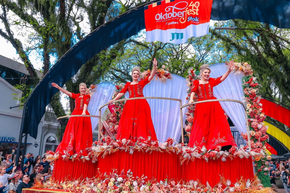 A comissão de frente teve os bailarinos do Jef’s Studio de Dança, que executaram coreografia com montagem de um mosaico homenageando as quatro décadas de festa. Em seguida, desfilaram a Coordenação Voluntária liderada pelo presidente Mathias Bertram, seguida da Fubica do Fritz, que trouxe o prefeito Sérgio Ivan Moraes e a primeira-dama Fátima Alves da Silva. Secretários municipais e servidores da Prefeitura de Santa Cruz do Sul, parceira da Assemp na realização da Oktoberfest, vieram logo após.