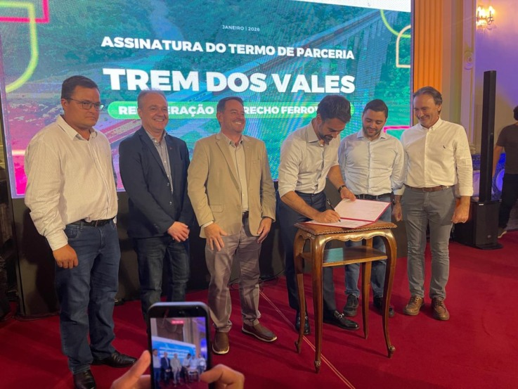 Em cerimônia realizada em Porto Alegre, no fim da tarde desta quinta-feira, 29, o governador Eduardo Leite assinou o termo de parceria para a recuperação e retomada do Trem dos Vales. O trecho de 18,5 quilômetros liga os municípios de Muçum e Vespasiano Corrêa, no Vale do Taquari, e sofreu fortes avarias na enchente histórica de maio de 2024. O investimento é de R$ 6,5 milhões. Segundo Leite, a expectativa é que o funcionamento seja retomado em seis a sete meses. O passeio tem duração de cerca de duas horas.