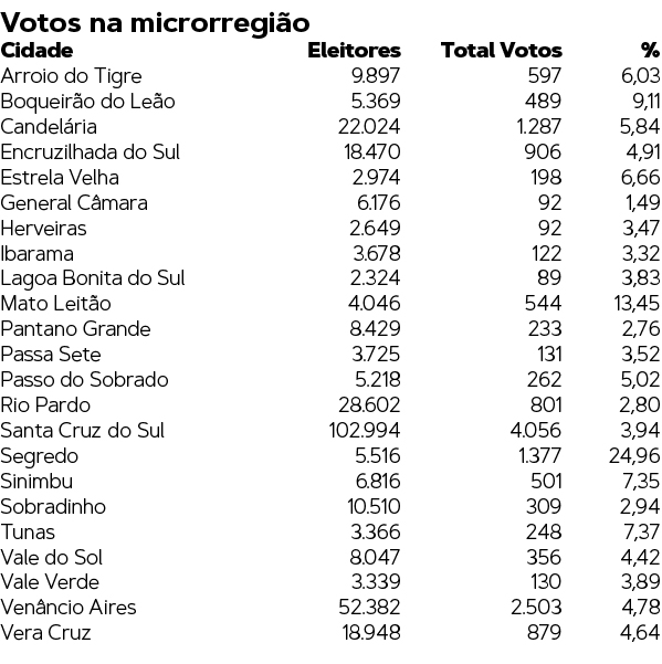O Conselho de Desenvolvimento do Vale do Rio Pardo (Corede-VRP) recebeu, no início da tarde desta terça-feira, 14, os resultados parciais da votação da Consulta Popular 2025, encerrada no domingo. Foram registrados 16.202 votos, números muito próximos aos registrados no ano passado, quando 16.268 eleitores participaram nos 23 municípios de abrangência. Destes, apenas General Câmara não atingiu índice de participação de 2% de eleitores. No Estado, a região ficou em terceiro lugar em números totais de votos, atrás das regiões das Missões e do Médio Alto Uruguai, que somaram 36.822 e 31.969 votos, respectivamente.