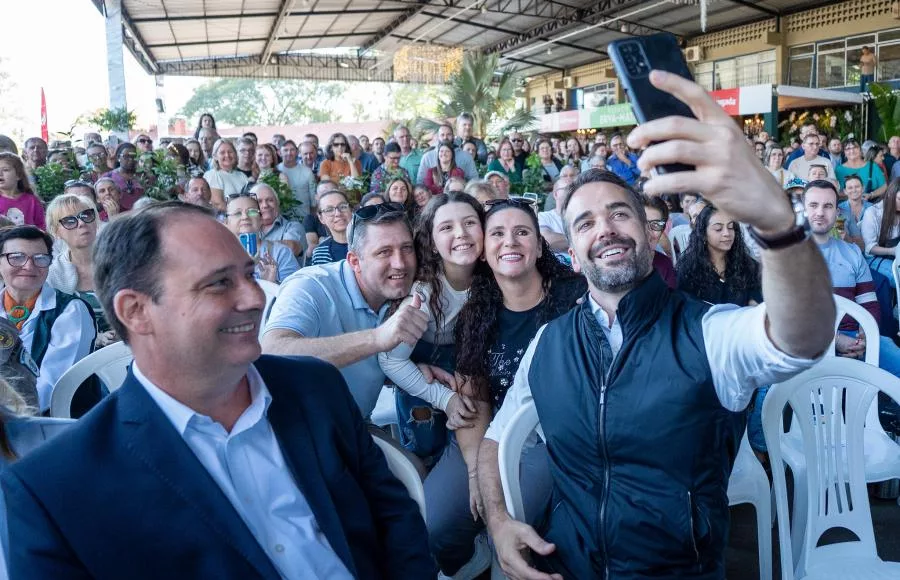 A Fenachim é conhecida por ser uma festa das famílias. O primeiro dia do evento, na quinta-feira, 1º, feriado, milhares delas passaram pelo Parque Municipal do Chimarrão. Fabiana Cristina da Silva, o marido Ademir da Cunha e a filha Rafaela Luiza da Cunha, de 10 anos, não apenas prestigiaram a programação do primeiro dia, como garantiram lugar na segunda fileira para acompanhar o cerimonial de abertura da Fenachim. O que eles não imaginavam é que o governador Eduardo Leite, aguardado para a solenidade, se acomodaria exatamente na cadeira em frente. “Foi uma emoção muito grande. O meu sonho era conhecer o governador”, contou Fabiana. “Quando me deparei que era ele sentado na minha frente, meus olhos encheram de água”, disse.