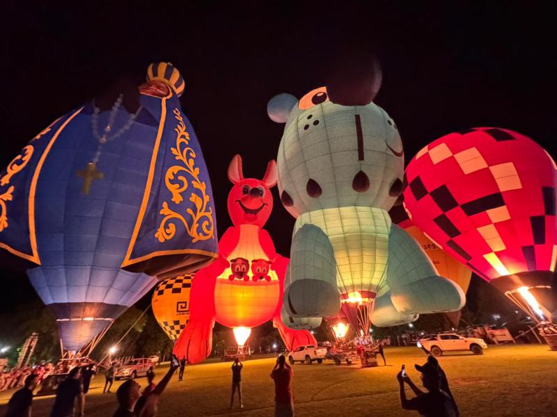 O 6º Festival de Balonismo de Venâncio Aires, realizado pelo Grupo Folha do Mate, encerrou com público de 65 mil pessoas no Parque do Chimarrão, de quarta até domingo. Um sucesso, uma mini Fenachim. Um evento consolidado. E as grandes estrelas encantaram. Uma dúzia de balões participaram. Mas o que mais impressionou o público foram os balões formato, de Nossa Senhora Aparecida, do Canguru e do Bidu, durante o Nigth Glow, quando todos os balões foram inflados no campo da Assive na noite de sexta, 21. Um espetáculo.