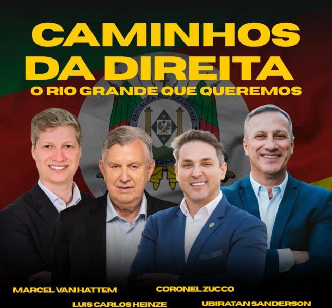 Diego Pretto, vereador do PP, de Encantado, divulga o encontro Caminhos da Direita, nesta sexta, 28, no CTG Giuseppe Garibaldi, em Encantado. Debater pautas da direita e estratégias para o Vale do Taquari, será o foco do encontro. Estarão lá os deputados federais do PL, Coronel Zucco, e Ubiratan Sanderson, e Marcelo van Hattem, do Novo. Também vai estar o senador Luiz Carlos Heinze (PP). No card de divulgação do encontro chama atenção a imagem de Zucco, que é pré-candidato ao governo do Estado, ao lado do senador Heinze, e os dois entre Marcelo e Sanderson, pré-candidatos ao Senado.