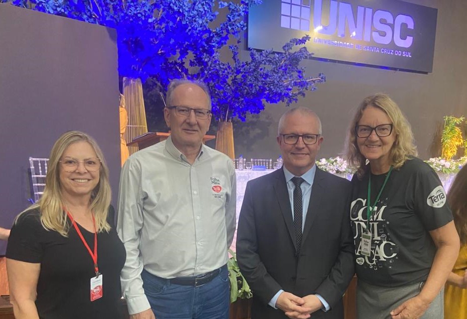 A Universidade de Santa Cruz do Sul (Unisc) oficializou, na tarde de quinta-feira, 11, a recondução do professor Rafael Federico Henn ao cargo de reitor e de Andréia Rosane de Moura Valim como vice-reitora, para o mandato 2026/29. O Grupo Folha do Mate esteve presente na cerimônia, realizada no auditório central do campus de Santa Cruz do Sul. Além do repórter Leonardo Pereira, responsável pela cobertura jornalística, estiveram na solenidade o diretor de Conteúdo, Sérgio Klafke, e as integrantes da equipe Comercial do Grupo, Liziane da Costa e Kinha Heck.