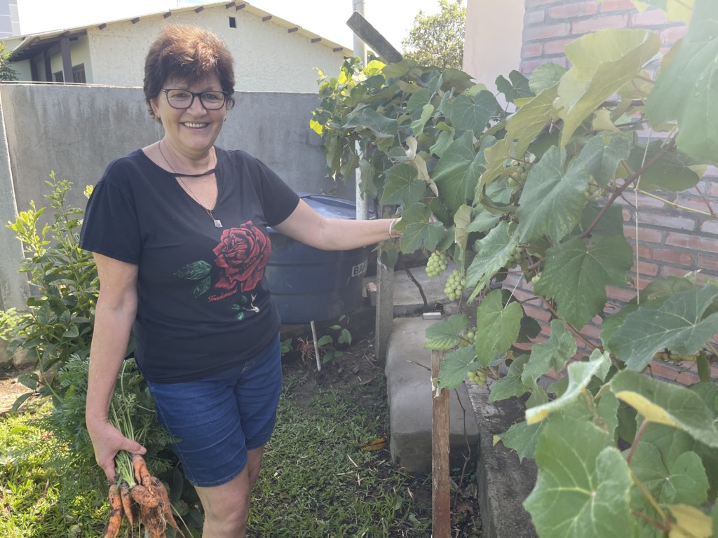 Para a cabeleireira e aposentada, é motivo de satisfação cultivar, em um espaço pequeno, uma diversidade tão grande de alimentos e, especialmente, contribuir com o meio ambiente. Além do quintal na frente de casa, o espaço nos fundos da residência também é aproveitado para cultivar frutas e verduras. Tem o que ela planta e “o que nasce por conta”, com sementes trazidas pelos pássaros, pelo vento ou que estão misturadas à terra. “O que mais gosto é olhar e ver este verde, as árvores e verduras crescendo, as abelhas que adoram as flores de manjericão e do maxixe”, comenta.