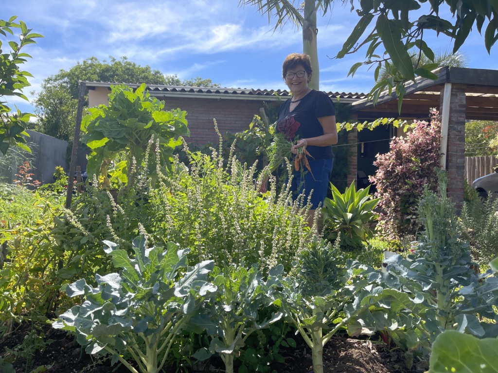 Para a cabeleireira e aposentada, é motivo de satisfação cultivar, em um espaço pequeno, uma diversidade tão grande de alimentos e, especialmente, contribuir com o meio ambiente. Além do quintal na frente de casa, o espaço nos fundos da residência também é aproveitado para cultivar frutas e verduras. Tem o que ela planta e “o que nasce por conta”, com sementes trazidas pelos pássaros, pelo vento ou que estão misturadas à terra. “O que mais gosto é olhar e ver este verde, as árvores e verduras crescendo, as abelhas que adoram as flores de manjericão e do maxixe”, comenta.