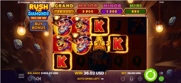 E para ficar ainda melhor, ainda há os Jackpots! O Rush for Diamonds oferece a cada jogador uma chance real de ganhar um dos quatro jackpots: Mini, Minor, Major ou Grand. Durante o jogo Hold and Win, Moedas Jackpot especiais podem aparecer, elas ficam bloqueadas na tela até o final da rodada. Se você tiver sorte, uma delas será sua.