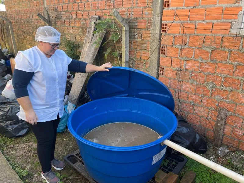 Já o biofertilizante é produzido a partir do ‘chorume’ que fica dos restos de comida. O produto é utilizado especialmente na adubação de hortas da própria escola e também fica disponível para a comunidade em geral. A segunda situação é observada também na Emef Cidade Nova, no bairro homônimo. “Como a gente não pode ter horta, a gente coloca todo esse resíduo em garrafas e deixa para a vizinhança buscar. Alguns alunos levam para casa também. É bem útil”, afirma a diretora Rosemeri Beier. A escola tem 345 alunos e, assim como a Pingo de Gente, também ocupa a capacidade máxima diária do biodigestor.